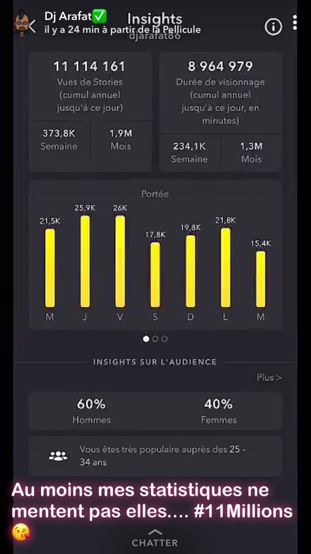 Une information que le Daishikan très enchanté a partagé avec ses fans sur son compte Snapchat avec en légende ‘’Au moins mes statistiques ne mentent pas elles… #11millions’’