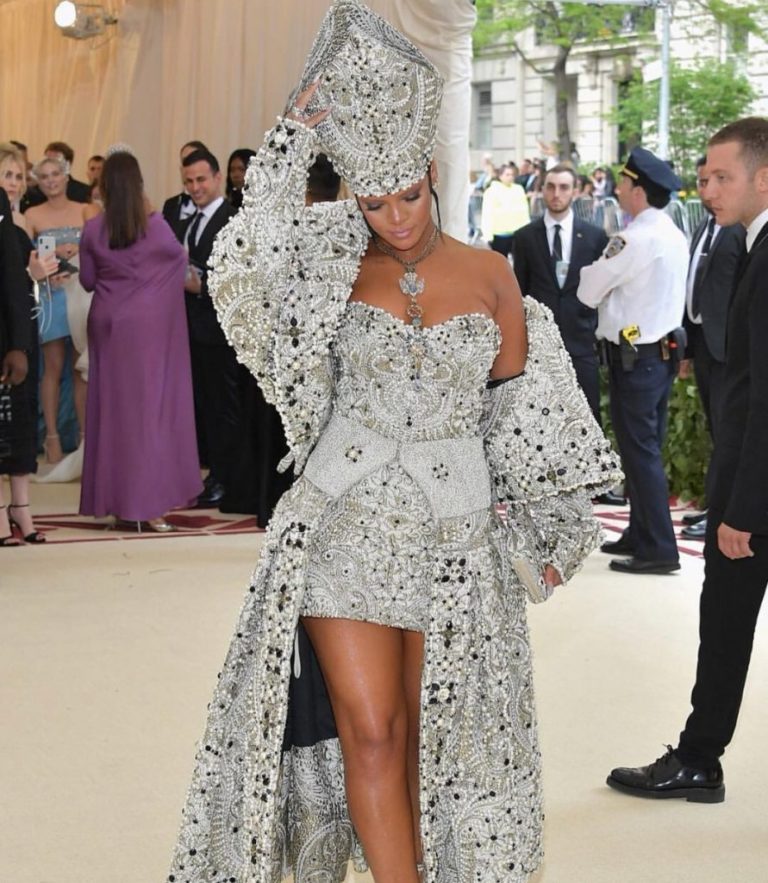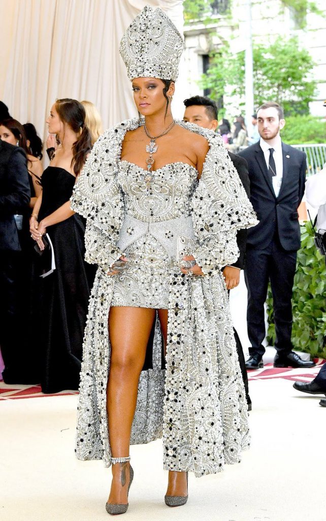 Rihanna est une icône en matière de mode et on pouvait s’attendre à une tenue extravagante pour le gala. La star a surpris tout le monde en s’affichant avec une robe argentée à bustier avec un manteau argent et une couronne sur la tête. La femme est complètement rentrée dans le thème de cette année et elle semble s’être légèrement inspirée de la tenue du pape. Son extragance a retenu toute l’attention des médias et la starlette a rapidement attiré l’attention.