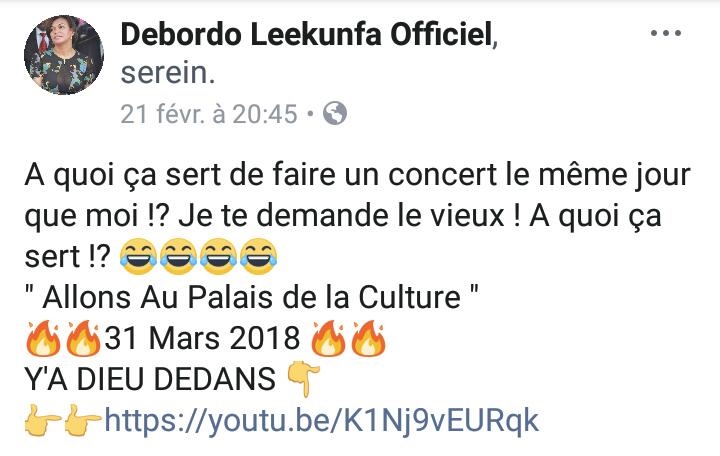 Arafat DJ a annoncé via son compte Snapchat la tenue de son concert le même jour que celui de Debordo Leekunfa. Une information qui a fait réagir le Maitré Maitré sur Facebook en ces termes : ‘’A quoi ça sert de faire un concert le même jour que moi !? Je te le demande le vieux ! A quoi ça sert !? Avec des émojis mort de rire…