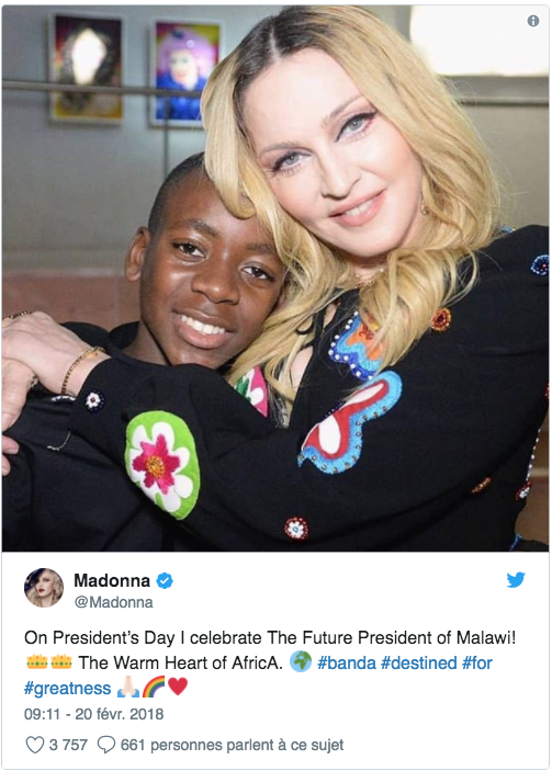 La pop star américaine, Madonna, a déclaré sur Twitter que son fils adoptif, David Benda, sera un jour président du Malawi.