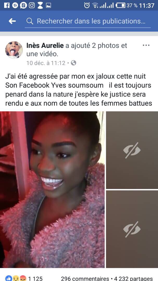 Elle a été agressée au visage avec un verre par un dénommé Yves Soumsoum qui s'avère être son ex. Pour Ines, l'acte était totalement volontaire car son ex copain sait combien de fois son physique compte étant donné qu'elle est passionnée de mode et makeup. Après deux jours de garde à vue, il a été relâché et le procès reconduit dans 4mois. Cette publication aura certes suscité la compassion de certains, d'autres par contre pensent que l'acte de l'agresseur pourrait être justifié.
